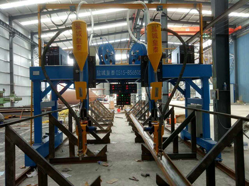 七、提供的配置部件 A、 行走驅動電機配用1.1KW減速電機2臺(杭州) B、 焊臂升降配用750W減速電機2臺(杭州) C、 焊劑回收機2臺、藥粉斗2套、吸咀2只和吸粉管2×5米(無錫) D、 配ZD—1250埋弧焊機2臺(成都華遠或者焊研) E、 導弧裝置2套(包括焊槍) F、 線纜移動滑車7只 G、 電器箱1臺、控制箱1臺, 電器(正泰), 變頻器(富凌) 八、易損件(不在包修范圍) 導電桿,導電咀,導弧架壓輪,送絲管,焊劑回收管,送絲輪,回收機布袋,導向軸承,焊槍微調裝置,所有控制按鈕。 九、技術文件 A、整機基礎圖(合同生效后發(fā)用戶) B、整機使用說明書(含線路掛線支架制作圖、V型架制作圖) C、裝箱單 十、需方提供的部分 1、24㎏路軌36米 2、按提供的資料做好基礎。 3、線路掛線支架。 4、焊件V型架 5、減速機用(40-46號機械油) 6、進相線50平方*3+1(長度30米)、10平方+1(長度8米) 7、需方按供方提供的資料做好基礎、焊接件后通知供方進場安裝。 | |||||||||||||||||||||||||||||||||||||||||||||||||||||||||||||||||||||||||||||||||||||||||||||||